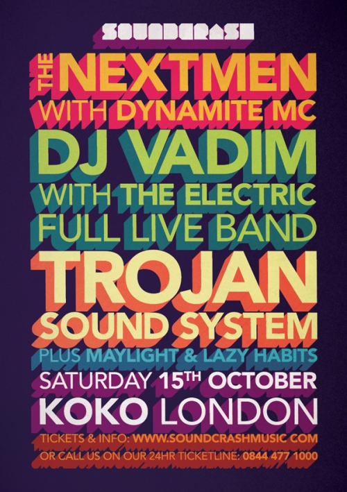 Event: Soundcrash at KOKO Line-up: The Nextmen ft. Dynamite MC + Dj Vadim ft. The Electric + Trojan Sound System + more tba Venue: KOKO Date: October 15th 2011 Tickets: 15.50 advance, 20 on the door Available from: www.soundcrashmusic.com /