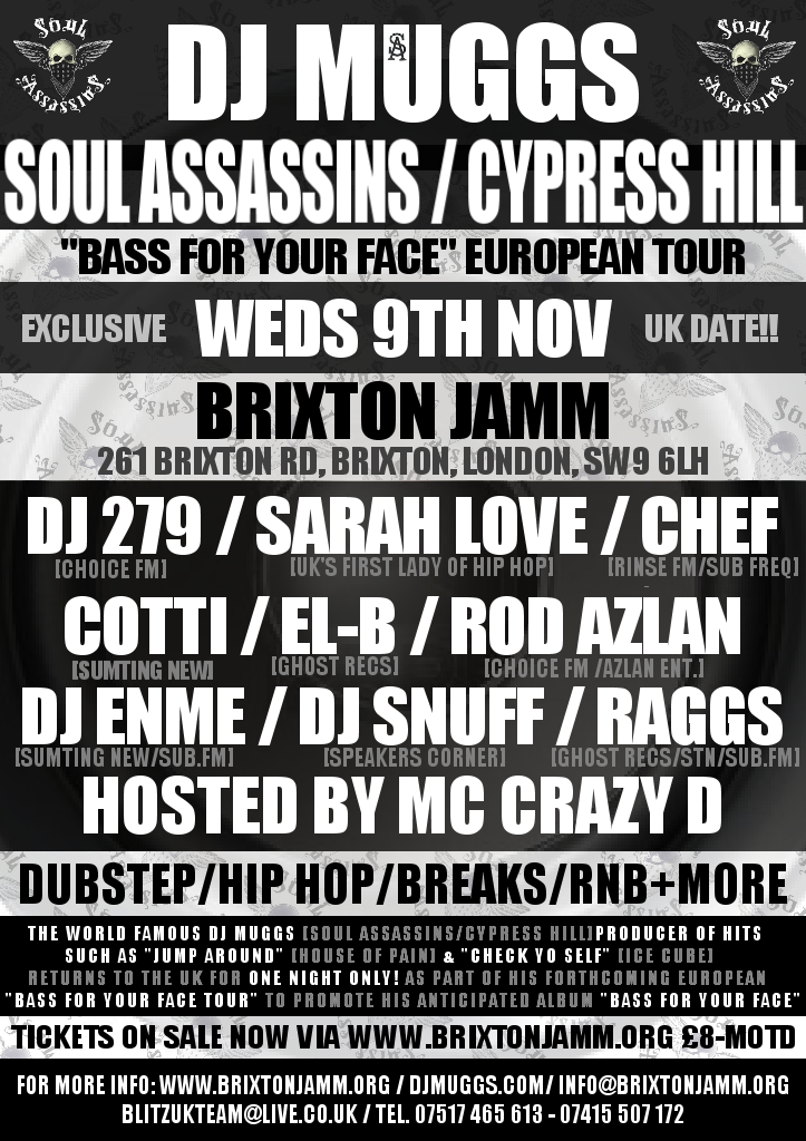Cypress Hill and Soul Assassins DJ Muggs hits London on Wednesday 9th November at Brixton Jamm as part of his “Bass For Your Face” European Tour. Support on the night comes from the UK’s “1st Lady of Hip Hop” DJ Sarah Love, who has also just been confirmed as Aloe Blacc’s official UK tour dj in December.