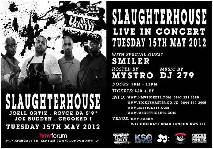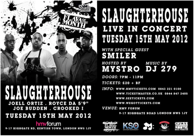 The UK Slaughterhouse Tour (Joell Ortiz, Royce Da 5’9”, Joe Budden & Crooked I) Tuesday 15th May (London) Wednesday 16th May (Birmingham) Thursday 17th May (Manchester)