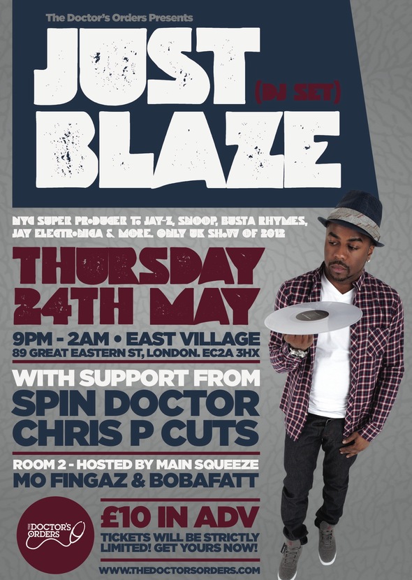 The Doctor’s Orders present Just Blaze (Only UK set of 2012) 9pm-2am Thursday 24th May 2012 @ East Village, 89 Great Eastern St, London EC2A 3HX. Doctors Orders Website