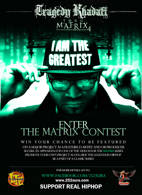Hip Hop Legend Tragedy Khadafi is offering Emcees & Producers the chance to appear on his new album “Thug Matrix 4.0” The winning Emcee will also get a chance to appear in one of the Album videos alongside Tragedy Khadafi. To enter the contest simply sign up on www.252aura.com and submit beats & verses to the drop box link or via soundcloud. Be a part of the classic “Matrix” album series & work with one of hip hop’s Greatest artists.