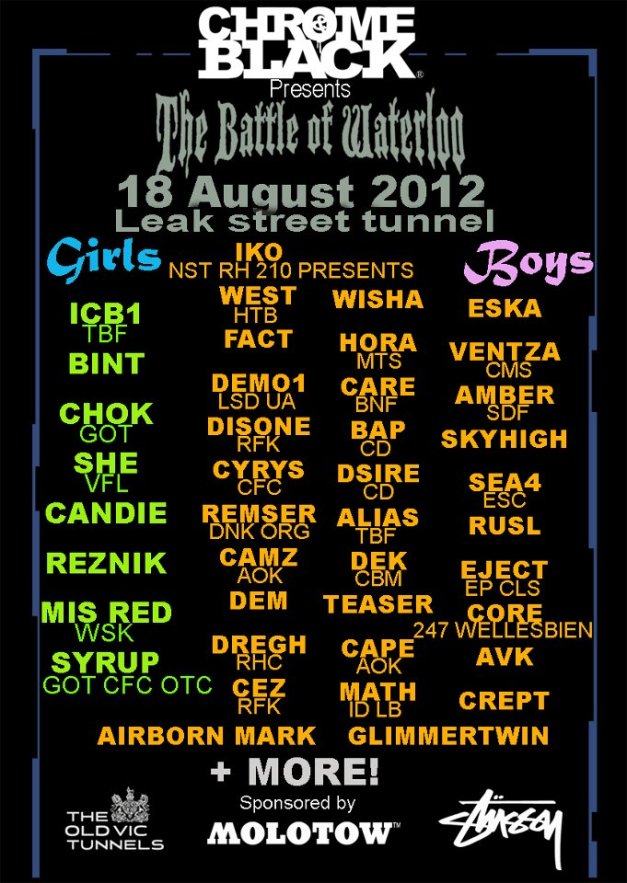 Sponsors this year are Belton-Molotow, Stussy, and The Old Vic Tunnels. Starting at around 10 am and running till dark, Chrome & Black also have 4 secret judges but you wont know who they are till they announce the Queen and King of Leak Street