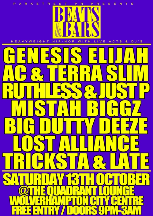 After the success of our first event back in August we are proud to announce that Beats & Bars is back for its second event and this time around we’ve got an all-star line-up for you. This is Beats & Bars and this is 100% Hip-Hop music with live acts and deejays!
