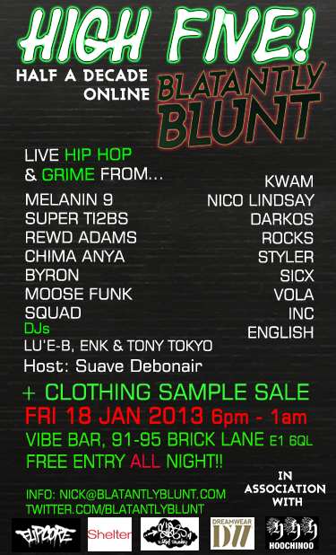 Five years is a long time in the blogging world, which is why on January 18 Blatantly Blunt is throwing a free party with donations going to homeless charity Shelter. The night is made even fresher with a clothing sample sale from some of the best up-and-coming brands peddling their garms.