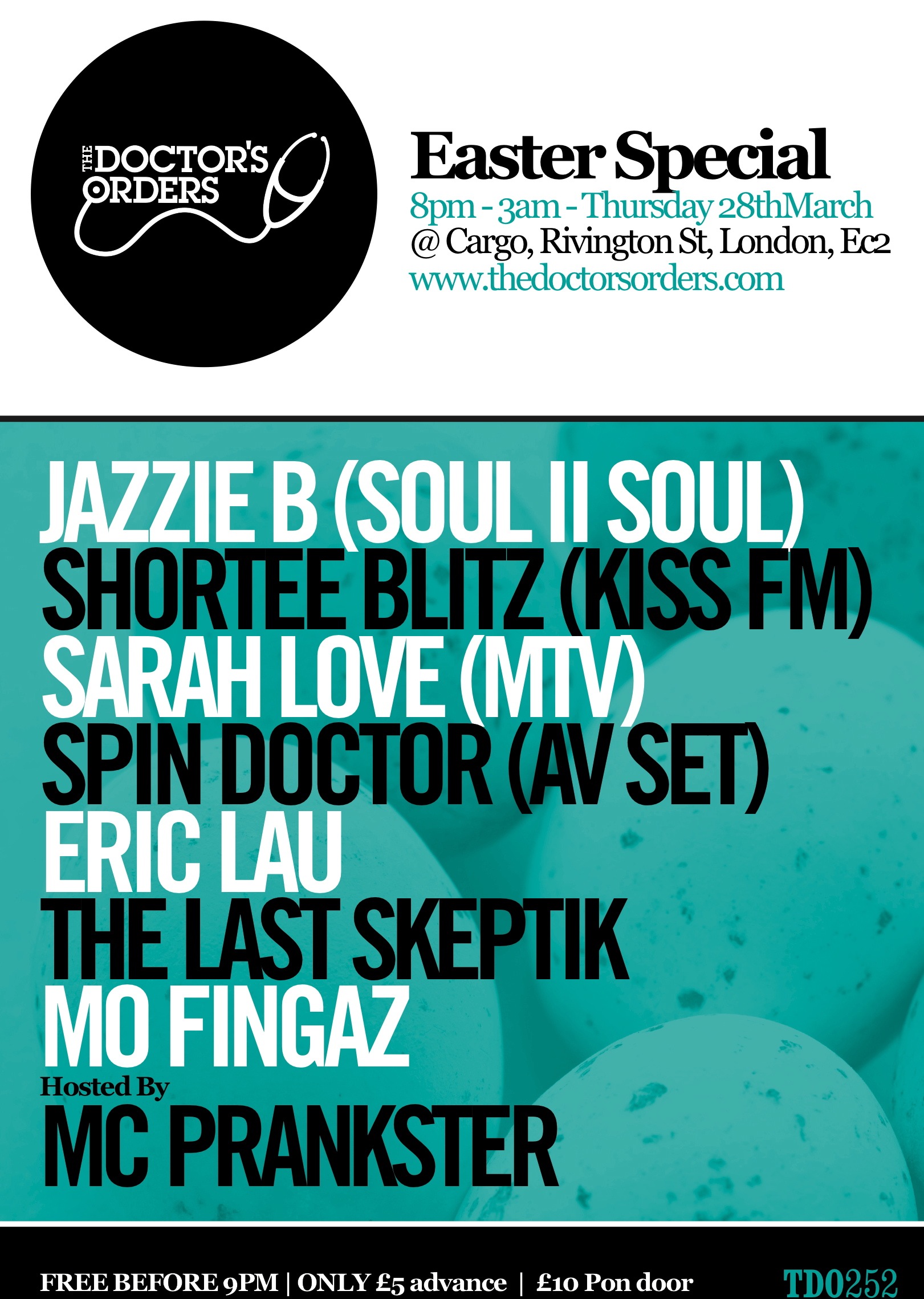 Bringing the uncut Hip-Hop bangers we have Kiss FM’s Shortee Blitz and the first lady of Hip-Hop Sarah Love both of whom have travelled the world and the airways since cutting their teeth rocking clubs. Coming with something a little different, as he always does, The Doctor’s Orders head honcho Spin Doctor will be spinning an all AV set of your favourite videos.