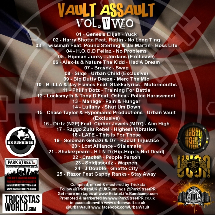 Well respected urban music blog, portal & clothing line http://www.UrbanVault.co.uk have been supporting the worldwide scene ever since its birth. Now in 2014 it’s known as one of the leading urban music websites, with numerous daily posts and a slick range of merchandise & clothing available. Back in 2010 Urban Vault hooked up with Tricksta from UK Runnings mixtapes and as a sponsored artist their working relationship grew and in December 2011 they dropped ‘Vault Assault Volume 1’ which had over 2000 downloads and 18,000 plays.