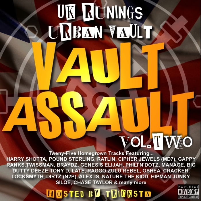 In 2012 Tricksta took some time off the mixtape circuit to release his production album ‘Out Of Darkness Cometh Light’. Now fully back on his mixtape grind we get Volume 2 of the Vault Assault series. This excellent twenty-five track mixtape features Harry Shotta, Pound Sterling, Ratlin, Cipher Jewels (MD7), Gappy Ranks, Twissman, Iron Braydz, Genesis Elijah, Phili’n’Dotz, Manage, Big Dutty Deeze, Tony D, LATE, Raggo Zulu Rebel, Oshea, Cracker, Locksmyth, Dirtz (N2P), Alex-is, Nature The Kidd, Hipman Junky, Silqe, Chase Taylor & many more.