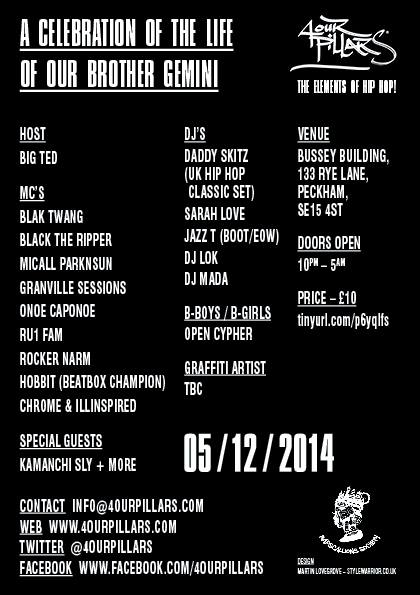The 4our Pillars events are funded and run by some of the founding artists of the UK Hip Hop scene that helped pave the way for many of todays’ young MC’s. Their events incorporate the main 4 elements of Hip Hop (BBoy-ing, DJ-ing, Graffiti and MC’s) under one roof for the night. This time they’re bringing the event to the famous Bussey Building in South East London