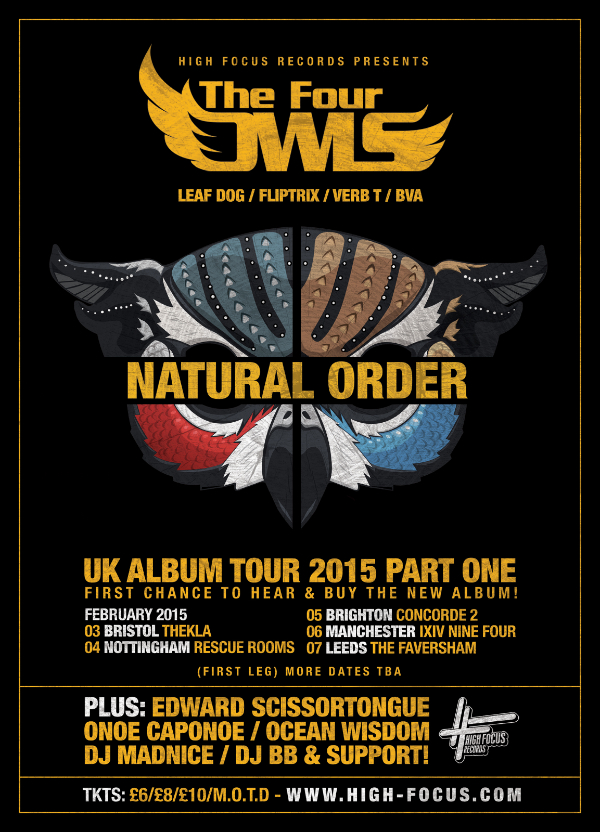 Possibly one of the most anticipated albums in UK Hip Hop history, The mighty Four Owls are back with a bang in early 2015 with their brand new album entitled ‘Natural Order’. Following on from the modern day classic ‘Nature’s Greatest Mystery‘, The Owls have evolved their incredible formula into an even greater force and have even recruited the legendary DJ Premier to feature on the upcoming record. The highly acclaimed group, renowned for their energetic live shows, are also embarking on a two part tour of the UK to showcase the new awe inspiring album alongside Edward Scissortongue, Onoe Caponoe, Ocean Wisdom, DJ Madnice & DJ BB!