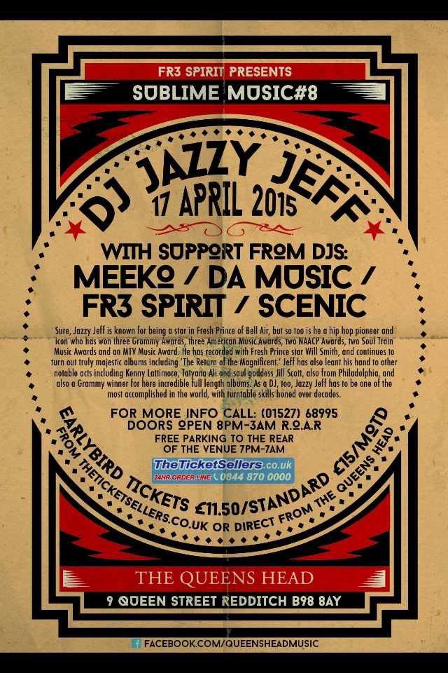 DJ Jazzy Jeff plays the Midlands… 17th April Posted by hiphoplifeandtimes on March 23, 2015 Posted in: Events. Leave a comment 1 Share this: Click to share on X (Opens in new window) X Click to share on Facebook (Opens in new window) Facebook Like Loading... Related Posts navigation ← Filthy Funk | Burn ‘Em Up [Music Video]: SBTV @FilthyFunkUK Beats & Bars Swindon Sat 4th April @GenesisElijah @TonyDPoison @Locksmyth1 @PhoenixDaFire @BGeniusHV @ParkStreetPR →