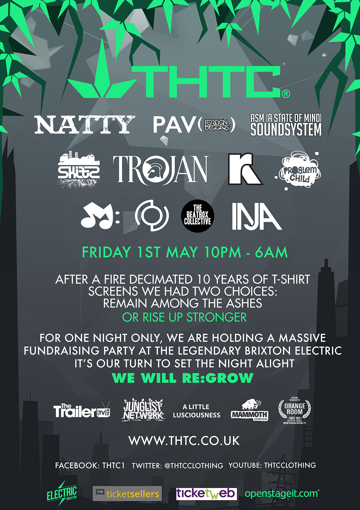 Award winning ethical street wear brand THTC (The Hemp Trading Company) announces its huge fundraiser party to raise money for its new season’s range following a devastating fire destroyed 10 years worth of their t-shirt screens.