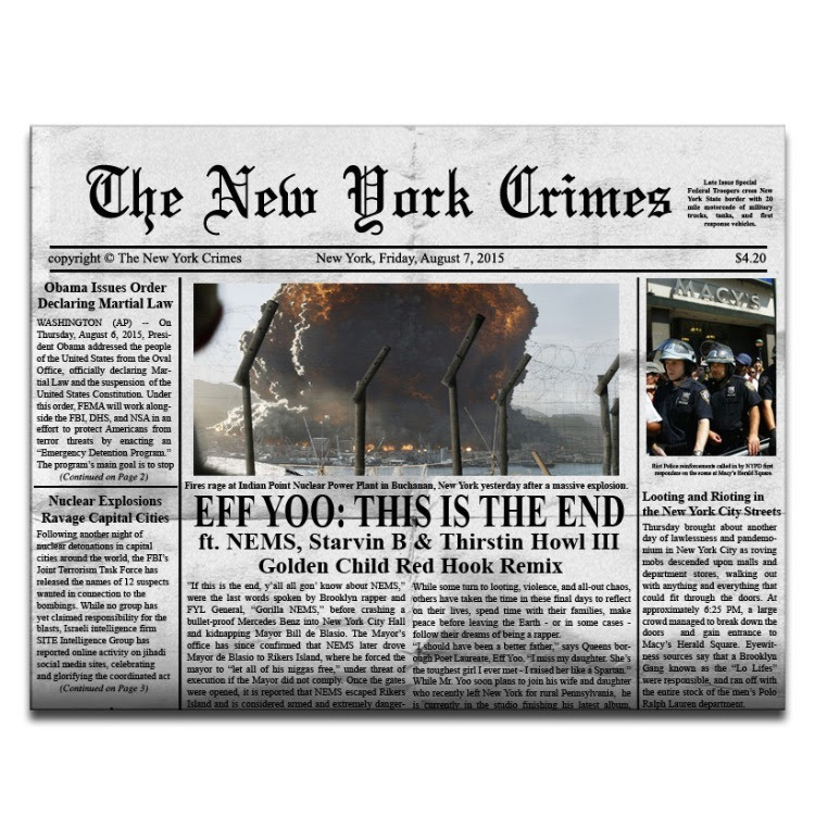 What would 4 of the grimmiest NY hip hop artists do if the apocalypse was here? Find out as “This is the End”, one of the stand out tracks from Eff Yoo’s critically acclaimed “Papa Dios” album, gets the remix treatment by Brooklyn producer and long time Eff Yoo collaborator Golden Child. Featuring NEMS , Starvin B and Thirstin Howl the 3rd, “This is the End” is the first single from the Resurrection Eedition of Papa Dios which includes 5 remixes and a brand new interlude which only adds to the allure of an album that’s already named by many on their “best of” list for 2015.