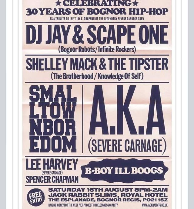 I moved to Bognor Regis from London also in the late eighties as a teenager and had already got the bug for Hip Hop culture through my introduction to BBoys and Breakin’, little did I know moving to Bognor from the city was gonna turn me into a full blown Hip Hop junkie, and Lee and Severe Carnage played a large role in that. So when Lee’s younger brother and old school friend of mine, Spencer asked me to help promote the event again this year, I was more than happy to help.