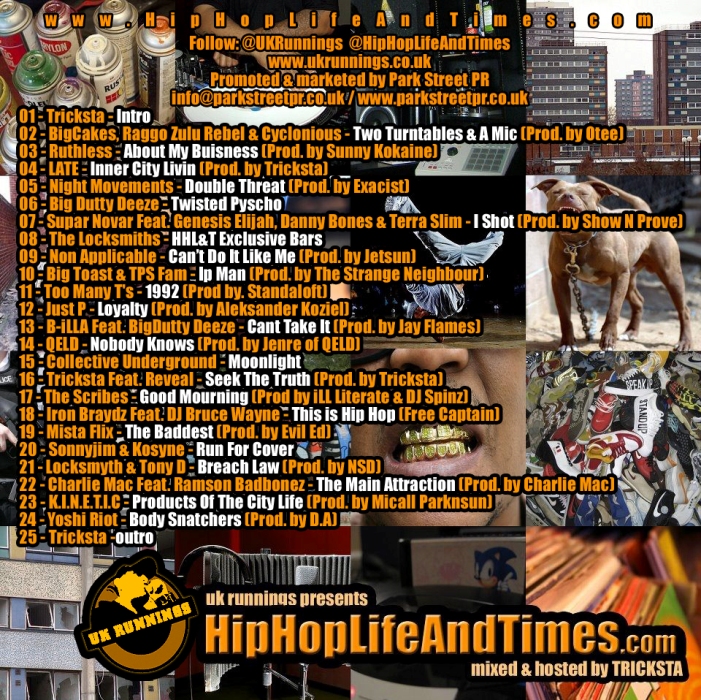 Special Shout outs to Tricksta at UK Runnings/ParkStreet PR, Big Dutty Deeze not only for his killer verses on the mixtape, but also for his work on the front and back cover artwork, all the dudes on this mixtape, and of course all of you that have supported us over the last year and half.
